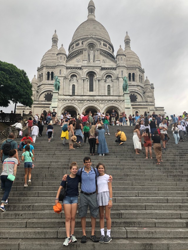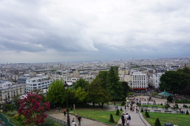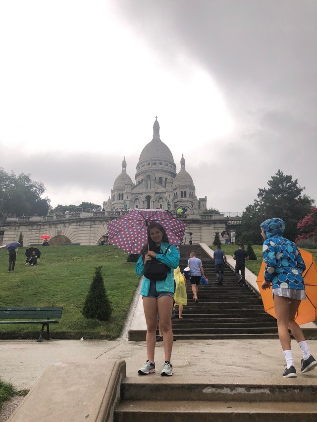 Unfortunately, our lucky vacation weather streak came to an end today. We woke up pretty late because it was pouring all morning and then we headed to an area called Montmartre, via the Metro. It wasn’t a particularly nice part of Paris but we had to get to the Basilica of Sacre-Coeur. The church is built really high up so you can get a nice view of Paris from the top of the stairs. It was rainy and cloudy so the view wasn’t amazing but it was still cool.