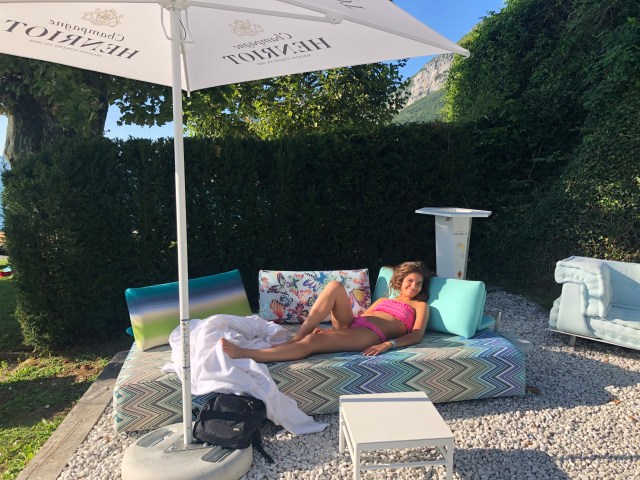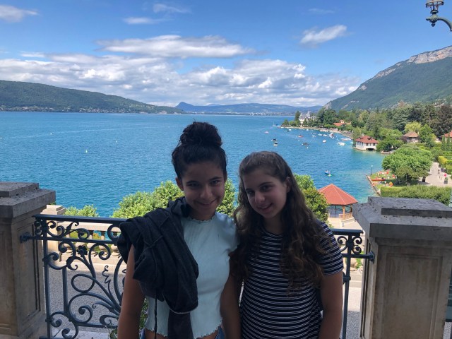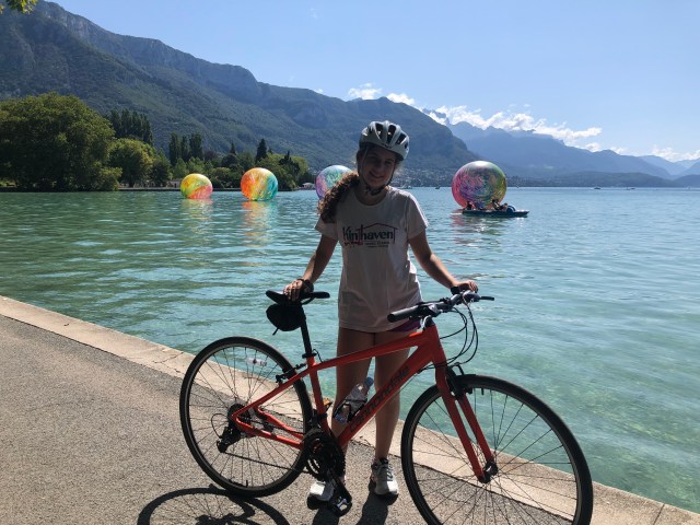 This morning, we headed to the bike shop where we got some coffee and bread as well as our bikes of course. There is a bike loop that goes around the entire lake Annecy that we were prepared to ride. It was about 28 miles. Unfortunately, the beginning part was a very long steep hill on the main road. We had to walk our bikes up most of that part but so did majority of the other people biking here as well. But there also are a lot of bikers here in Annecy who look like very serious bikers. Once we got up the hill we got to a separated bike path and it was all down hill or flat. It was a beautiful ride next to the lake which looked really blue today because it was a sunny day. We stopped for lunch next to the path about half way through and then continued back to the bike shop. Then, we drove back to our hotel where we got our bathing suits on and walked down to the lake. We swam and relaxed outside on the hotel couches. Fun fact: it stays light here for a really long time. Today the sun set at 8:45! We ate dinner outside in Annecy. The setting was nice but it wasn’t one of our better meals.