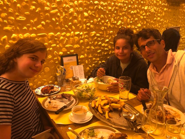 Next, we drove about 90 minutes where we stopped in a couple towns on Lake Geneva. One was an old medieval town that we quickly walked around and the other was a town on lake Geneva called Thonons-les-Bains. We took a funicular down to the lake and walked along the boardwalk. There were lots of boats and things here and there to see. Surprisingly the lake was quite choppy. There were waves splashing up to the boardwalk! Finally we drove to the city of Geneva. We stayed in Geneva a few years ago for the same reason as this trip (early morning flight the next morning at Geneva airport). We actually ate at the same restaurant we did last time. We ran out of steam to find a new place and liked it enough to go back. All they serve basically is chicken and salad but we enjoyed it. Now we are at the hotel getting some sleep before tomorrow’s flight.